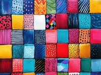 Blokken - dit is een abstract schilderij van een strak raster met kleurrijke vierkanten en blokken vol verschillende patronen en zichtbare verftextuur, een abstract schilderij en schilderij abstract dat vooral opvalt door heldere kleurvlakken en speelse motieven.
