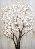 Abstract mixed media schilderij in een naturel kleurstelling met een boom en bloesem in Impasto verfstijl.