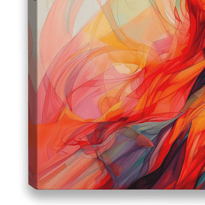 Een kunstwerk van een vrouw die een sierlijk kleurrijke jurk draagt die om haar heen wervelt in levendige tinten. De achtergrond is zacht en neutraal, waardoor de levendige kleuren van de jurk en haar gelaatsuitdrukking worden versterkt. De algehele compositie straalt een gevoel van beweging en emotionele diepte uit.