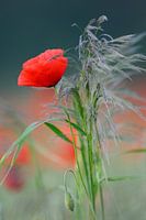 Flowering Poppy / Klatschmohn ( Papaver rhoeas ), wild, growing in a corn field together with some grass, natural bouquet.