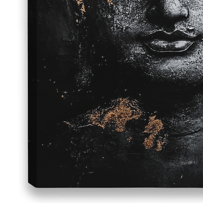 Dit ontwerp straalt rust, mystiek en verfijning uit. Het toont een serene Boeddha met gesloten ogen, gehuld in donkere tinten en subtiele gouden accenten. De textuur van de achtergrond en de gouden verfstrepen geven het schilderij een unieke, moderne touch. Dit kunstwerk past perfect in minimalistische en moderne interieurs, waar het…