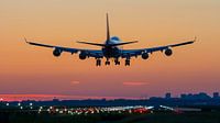 Boeing 747 landing op schiphol tijdens het eerste licht van de dag. Mooi oranje paarse lucht met op de achtergrond de skyline van Amsterdam.