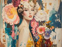 Dit Mixed Media Art schilderij, in een expressieve en moderne kunststijl met vleugjes impressionisme, vangt de essentie van vrouwelijke gratie en bloemrijke pracht.