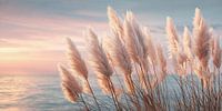 Delicaat pampagras wiegt zachtjes in de wind tegen de achtergrond van een schilderachtige zonsondergang boven zee. De zachte pastelkleuren van de lucht worden weerspiegeld in het kalme water en creëren een harmonieuze, rustgevende sfeer. De felle pluimen op de grassen contrasteren met de uitgestrektheid van de oceaan en geven de foto…