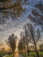 Bomenrij en de ondergaande zon op het Friese platteland nabij Schettens in het najaar met bijna kale bomen
