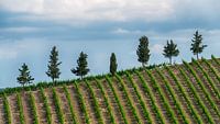 Op de voorgrond zijn de symmetrische lijnen zichtbaar van de wijnranken in de wijngaard, die leiden naar de bomenrij.