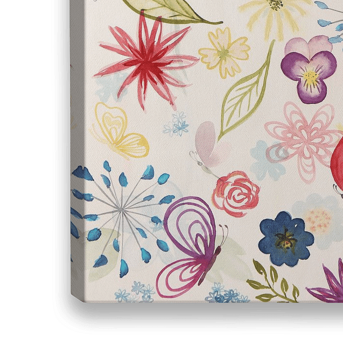 Een met aquarelverf geschilderde verzameling bloemen en vlinders in vrolijke kleuren. Perfect als behang om zo de ruimte een unieke uitstraling te geven.