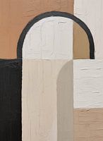 De compositie speelt met het concept van ruimte en diepte, waarbij de kleuren variëren van warme terracotta tot subtiele crème- en witnuances, met een krachtig zwart element dat een ankerpunt in het beeld vormt.