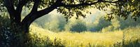 Boom Schilderij - Dit is een landschap schilderij met een grote boom en een stralende gele achtergrond die doet denken aan een zonnige dag, waar de lichtval door de bladeren een fijn schaduwspel creëert.