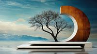 In deze surrealistische scène ontmoeten we een artistieke dialoog tussen natuur en architectuur. Een majestueuze boom, kaal maar vol expressieve kracht, torent uit te midden van een minimalistische, geometrisch sobere omgeving. De boom staat op een eenvoudig platform met meerdere niveaus dat zich uitstrekt over een spiegelglad oppervlak…