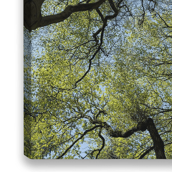 Een zonnige dag in het bos. Door het zonlicht oplichtend frisgroen blad van hoge bomen tegen een blauwe hemel. De donkere takken van de boomkruinen steken duidelijk af tegen de lucht en het jonge blad.