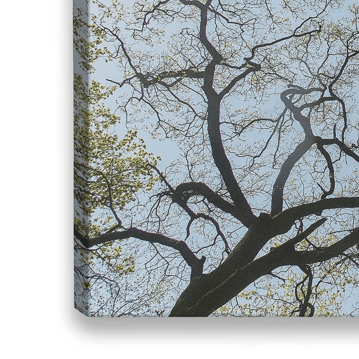 Uitbottende boomtoppen gefotografeerd van onderaf tegen blauwe lucht.