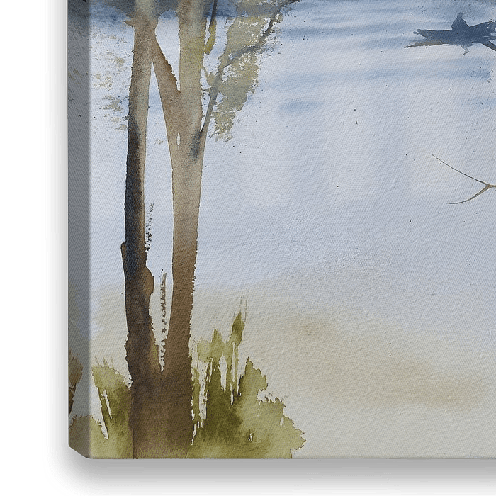 Deze aquarel ademt een serene, bijna dromerige sfeer uit. De kunstenaar gebruikt zachte penseelstreken en subtiele kleurvariaties in groen, blauw en bruin om een rustiek landschap vast te leggen. Op de voorgrond staan slanke bomen met transparant geschilderd gebladerte, waardoor het licht vrij spel krijgt en een gevoel van ruimte…