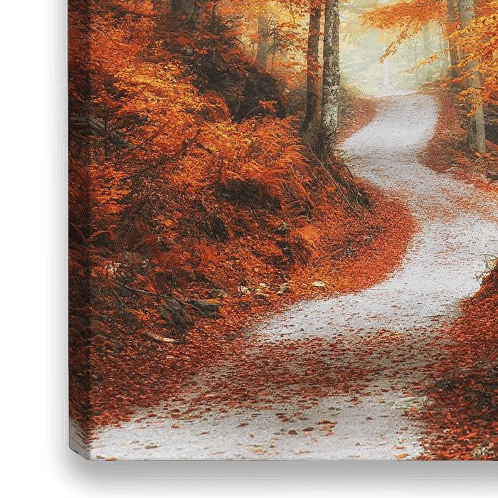 Een wit grindpad slingert tussen een geel en rood gekleurd loofbos door. De optrekkende ochtendmist in de achtergrond en de kleuren zorgen voor een mystieke sfeer. De foto is bewerkt om een sprookjesachtige sfeer te creëren.