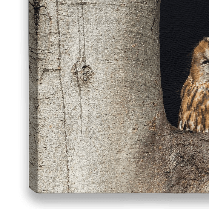 Een bosuil rustend in zijn of haar holle boom. De bosuil kan bij gevaar naar beneden zakken in de boomholte.