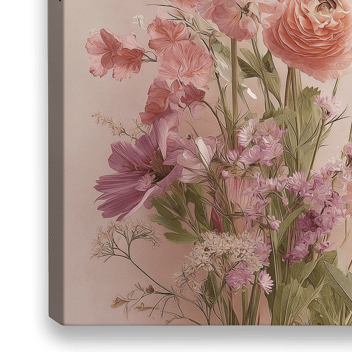 Een dromerig stilleven van prachtige zomerbloemen in zachte pasteltinten, waar cosmos, ranunculus en andere veldbloemen een romantische compositie vormen tegen een lichte achtergrond. De subtiele kleurschakeringen van roze en perzik creëren een etherische sfeer die doet denken aan een vintage botanische illustratie met een moderne twist.