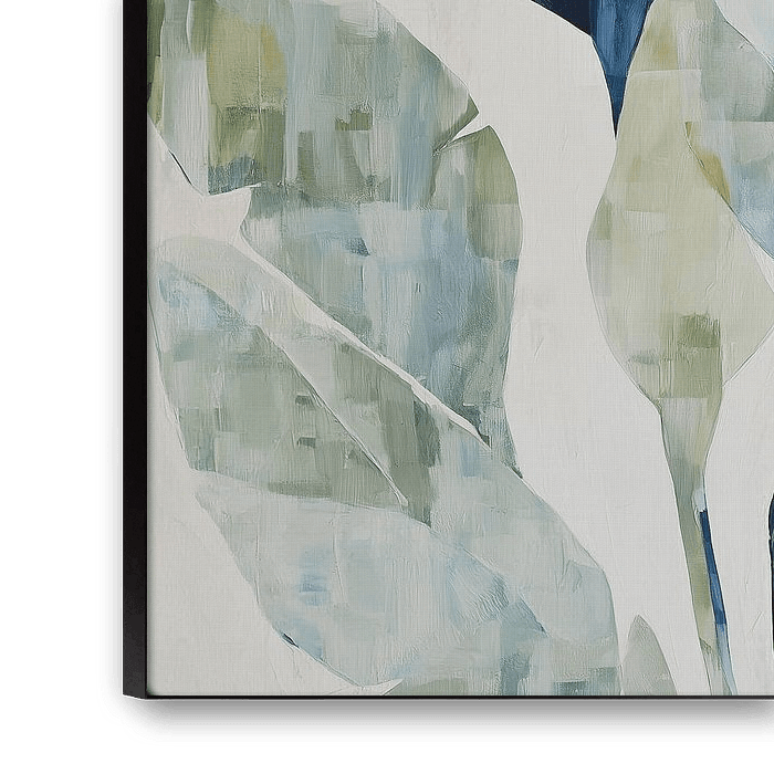 gestileerde botanische compositie waarin abstractie en natuur vloeiend in elkaar overlopen. De voorstelling toont verschillende bladeren en een centrale bloemvorm die doet denken aan een paradijsvogelbloem. De vormen zijn opgebouwd uit geometrische vlakken met zichtbare penseelstreken in een subtiel kleurverloop van groentinten tot diepblauw. Het kleurgebruik is ingetogen maar krachtig, met een mooi contrast tussen de koele tinten en de lichte achtergrond.