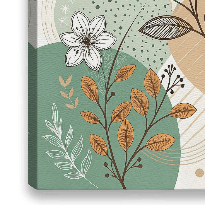 Dit is een moderne lijntekening met abstracte minimalistische botanische elementen. Het ontwerp bevat verschillende gestileerde bladeren, takken en bloemvormen weergegeven met strakke lijnen en subtiele arceringen. Een zacht, gedempt kleurenpalet van groen, bruin, oranje en crème creëert een rustgevend en organisch gevoel. De compositie…