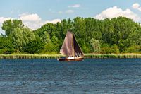 een eenzame Botter op het water in volle zeilen met een mooie achtergrond,