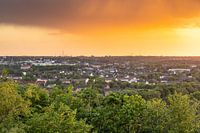 Uitzicht vanaf de slakkenberg Beckstraße over Bottrop bij zonsondergang met naderende onweersbuien.