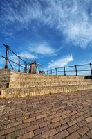 Bovenop de entreepoort van het Friese stadje Sloten, Gaasterland, met de molen herkenbaar op de achtergrond en een wegvluchtende poes.