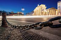 De beroemde Brandenburger Tor in Berlijn, met een keten van barrières voor de straat.