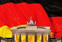 Koop de foto Brandenburger Tor met grote Duitse vlag op de achtergrond van Frank Herrmann op canvas, aluminium dibond, (ingelijste) fotoprint, behang en ArtFrame, op maat geprint in Fine-Art kwaliteit.