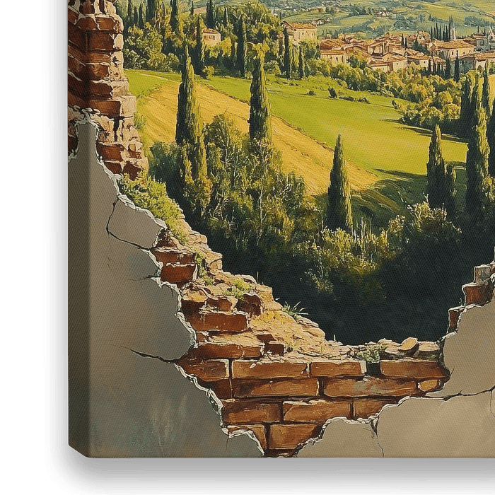 Breakthrough View - Dit landschapsschilderij toont een idyllisch, weids uitzicht op glooiende heuvels en een pittoresk dorpje, gezien door een ruig, gebroken stenen kader, wat een uniek doorkijkperspectief biedt.
