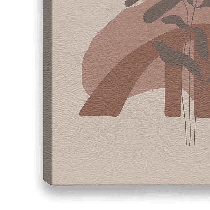 Minimalistisch landschap met een donkerbruine plant met bladeren, een chocolade-bruine brug, een licht bruine berg en de oranje, ondergaande zon op de beige achtergrond.