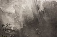 Een kudde buffels heeft stof doen opwaaien en trekt een steile helling op. Opgenomen in Mana Pools National Park, Zimbabwe