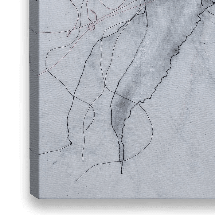 Een figuratief werk van zwart & rood draad, houtskool & krijt op doek. Een portret van een vrouw in de sensuele sfeer van (burlesque)noir. De dromerige en wegkijkende blik laat je afvragen wat haar gedachten zijn.