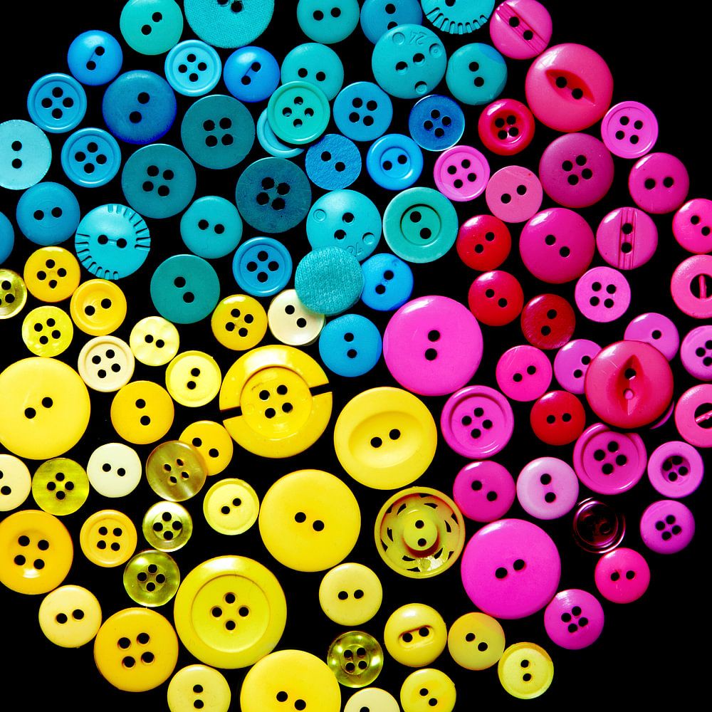 Het kleurenmodel Cyaan, Magenta en Yellow op een zwarte ondergrond speels door middel van knopen in een kleurenschijf gelegd. Is onderdeel van een tweedelige serie: RGB en CMYK. Beide verkrijgbaar bij Werk aan de Muur. Het werk is vierkant.