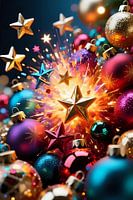 Een oogverblindende foto toont het moment van een explosie van kerstballen, bevroren in kristalhelder detail en vol dramatische energie. Glimmende kerstballen in rood, goud, groen, blauw en zilver dwarrelen uit elkaar, hun reflecterende oppervlakken weerspiegelen gefragmenteerde lichtflitsen, klatergoud en warm kaarslicht. De barstende…