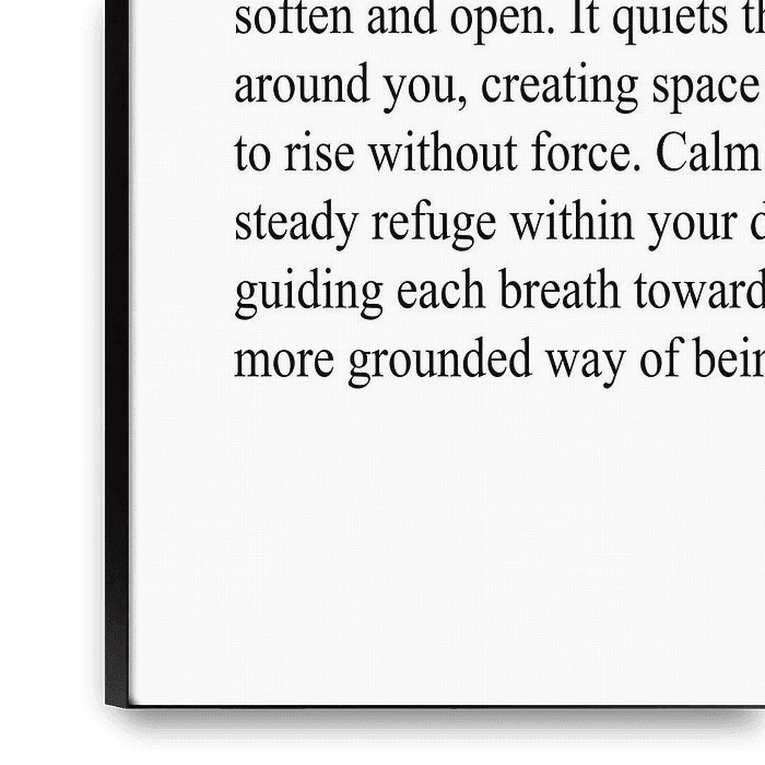 Deze minimalistische typografieposter legt de nadruk op het begrip 'Calm' en staat voor innerlijke rust, helderheid en bewuste kalmte. Het eenvoudige ontwerp past harmonieus in moderne woon- en ontspanningsruimtes. Calm beschrijft een toestand van zachte stabiliteit en rustige aanwezigheid. Ideaal voor ruimtes met een ontspannen,…