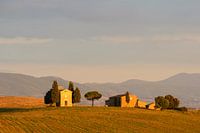 Capella della Madonna di Vitaleta, de prachtige kleine kapel op een heuvel in Crete, in het zuiden van Toscane, bij zonsondergang