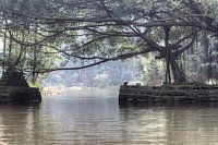 Langs de rivieren van Tam Coc zitten katten gezamenlijk aan de rand van een doorgang. Hopen ze op een visje?