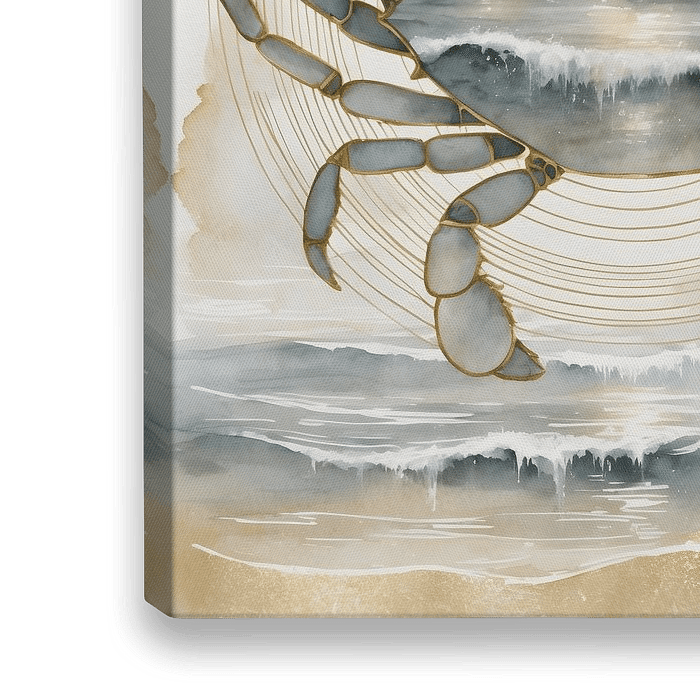 In Celestial Waves of Karkinos ontmoeten hemel en water elkaar in een eeuwige dans. De krab, symbool van bescherming en intuïtie, rijst op uit de golven terwijl gouden lijnen haar verbinden met de maan boven de zee. In haar pantser weerspiegelt het ritme van eb en vloed — het hart van de oceaan dat klopt op het tempo van de sterren.