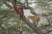 Een luipaard checkt nog even zijn vangst, die hij enkele seconden daarvoor op zijn plek in de boom heeft gehangen.