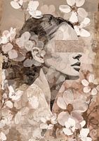 Afbeelding van een vrouw met kersenbloesems in de kleurstelling wit, beige, bruin, grijs en zwart. Verschillende lagen die in elkaar doorlopen zorgen voor een extra kunstzinnig effect. Passend bij diverse stijlen en trends. Verscholen in de bloemen, dromend van de lente en de zomer en de liefde.