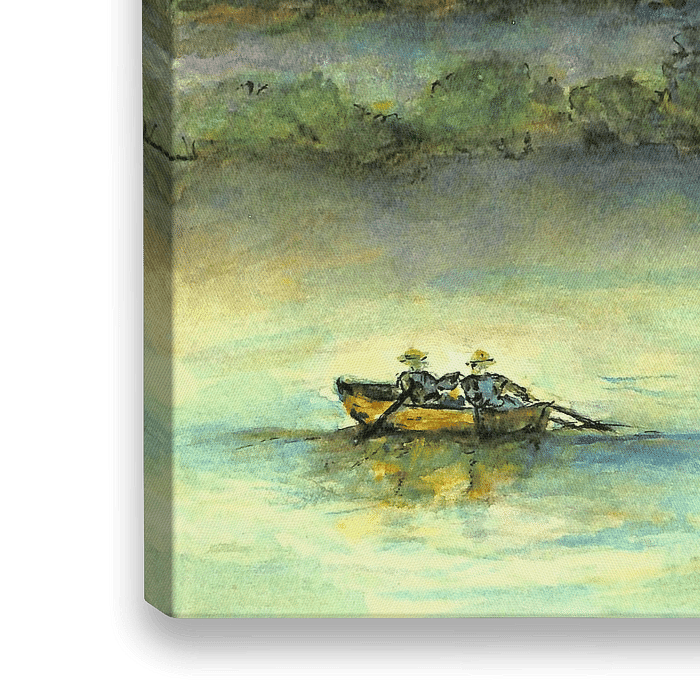 Een aquarel ven Chinese vissers in de opkomende zon. De zon straalt op de bomen die zachte schaduwen in lichte paars blauwe kleuren geven op het water. Het bootje licht op in de zon en weerspiegelt in het water. De lucht kleurt blauw groen met geel van de opkomende zon. Het is een zacht en rustig stilleven.