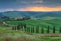 Een prachtige slingerende cipressenlaan die uitkomt op een Agriturismo een verbouwde boerderij waar je kunt slapen. De zonsondergang na een flinke onweersbui maakt het beeld geheel af.