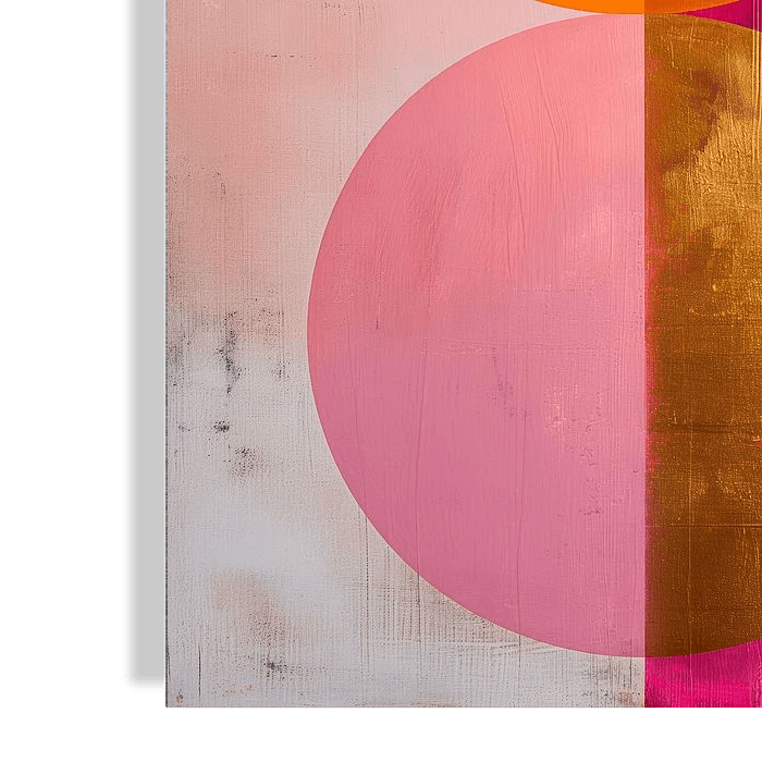 Mooi geometrisch kunstwerk van overlappende cirkels in magenta, roze, en goud tinten. Prachtig als solo werk, maar ook heel goed te combineren met één of twee andere werken uit deze serie.