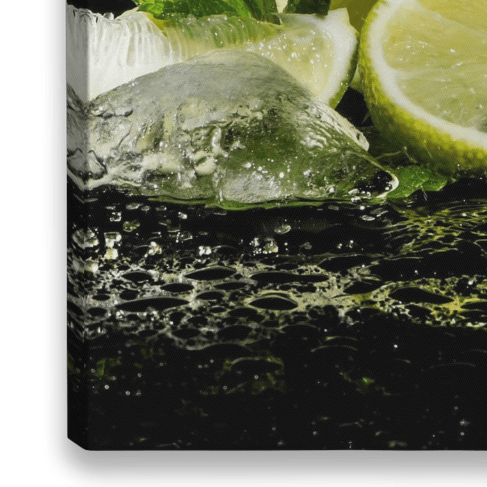 Deze verfrissende schijfjes citroen met een plukje groene frisse mint en ijsblokjes zijn een lust voor het oog. Het spat letterlijk en figuurlijk van de foto af. Vitamine C is volop aanwezig. Fris en fruitig. Geel en groen steken mooi af tegen een donkere onder en achtergrond. Het frisse ijswater spat alle kanten op. Een chique en luxe…