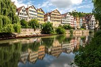 De oude vakwerkhuizen weerspiegelen fraai in het water van de rivier Neckar.