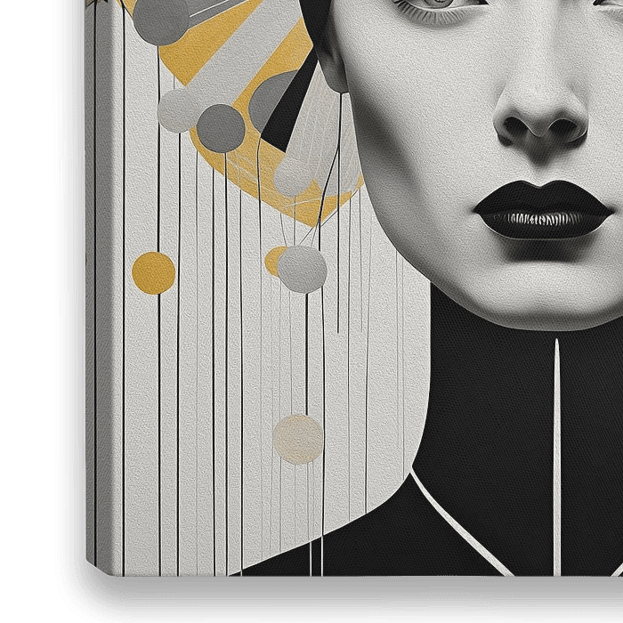 Dit opvallende kunstwerk, speciaal ontworpen als eyecatcher voor je huis, toont een intrigerend zwart-wit portret van een vrouw, verweven met strakke geometrische vormen. Haar expressieve gezicht komt tot leven te midden van de scherpe lijnen en hoeken, waardoor een visueel boeiend contrast ontstaat. De beperkte kleurenpalet van zwart,…