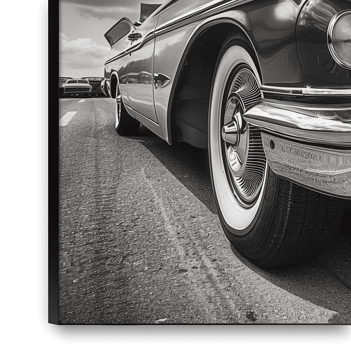 Classic car in zwart wit, met een contrastrijke wolkenlucht.