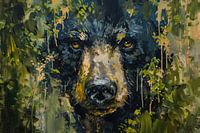Dit werk toont een close-up van het gezicht van een beer, omgeven door groen gebladerte. De beer heeft donkere ogen die intens en doordringend lijken, terwijl zijn vacht is weergegeven in verschillende tinten zwart en bruin. De groene bladeren om het gezicht van de beer creëren een harmonieuze mix van kleuren, waardoor de beer lijkt op…