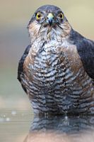 Close-up van een mannetjes sperwer. Genomen in een schuilhut op de Kalmthoutse Heide. Na een warme lentedag kwam hij een bad nemen bij de poel. Zijn prachtige ogen zorgen voor een gevaarlijke blik.