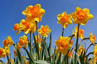 Een vroeg lente beeld met een Close-up van gele narcissen in een groot bloembollenveld. Een beeld vanuit de bollenstreek omgeving van Lisse.