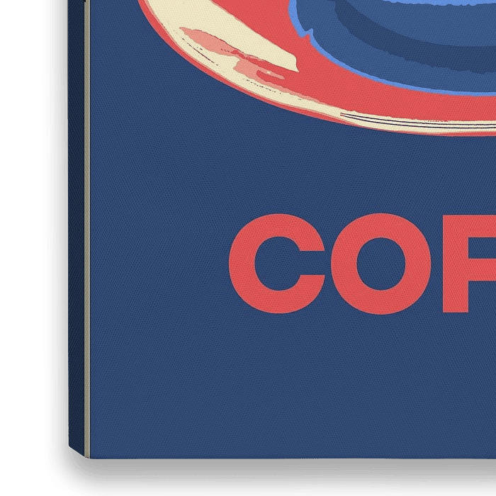 Een gestileerde afbeelding toont een koffiekop met schotel in krachtige kleuren - rood, beige en licht- en donkerblauw - tegen een donkerblauwe achtergrond. Onder het kopje staat het woord "COFFEE" in bijpassende kleuren.